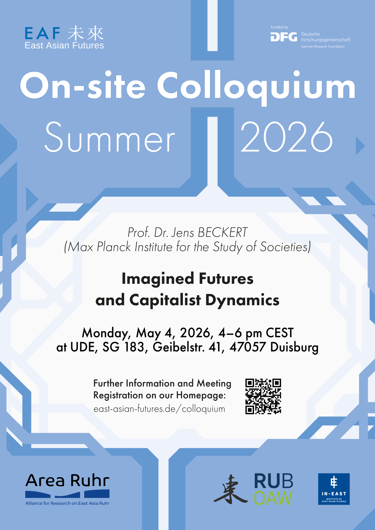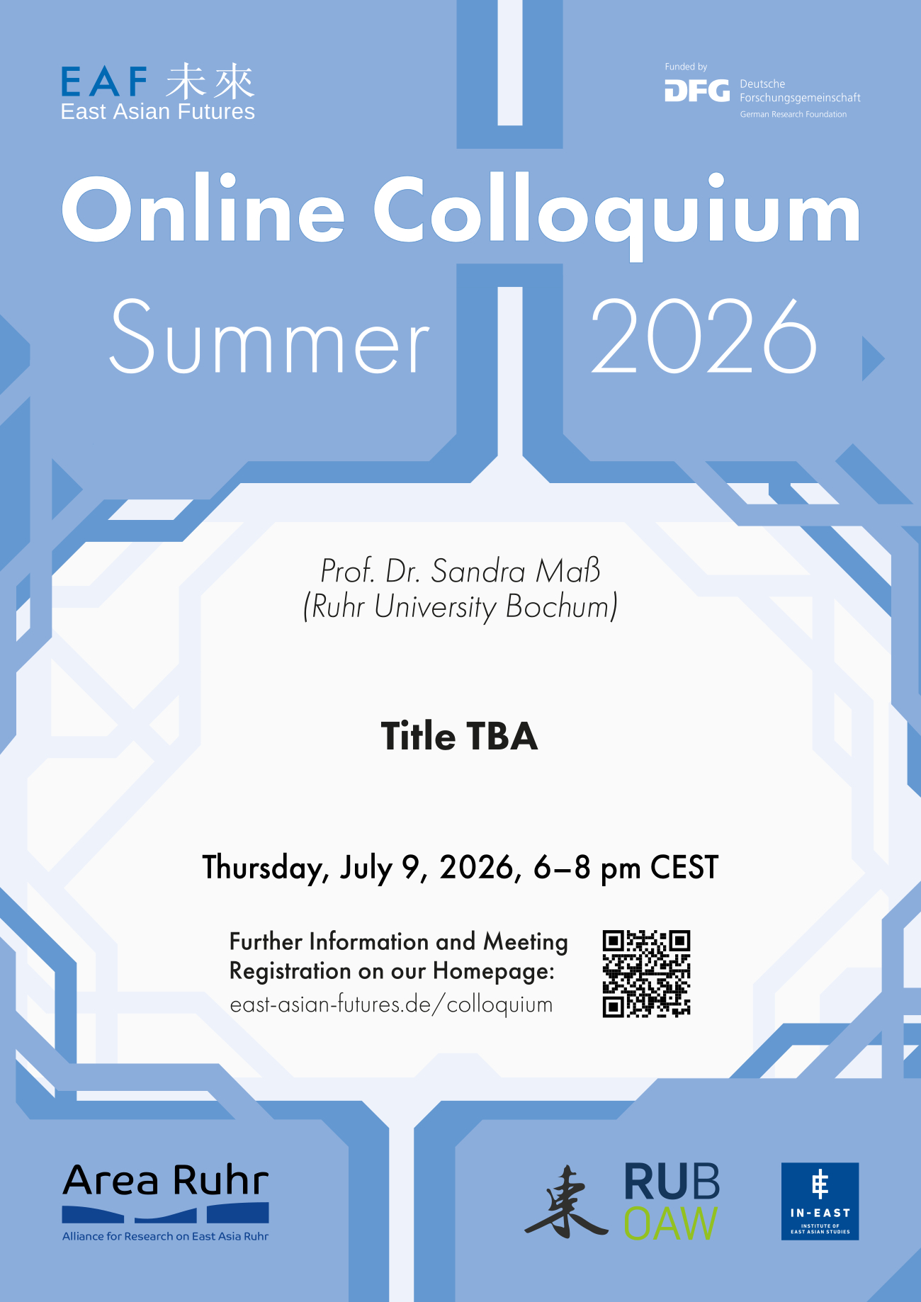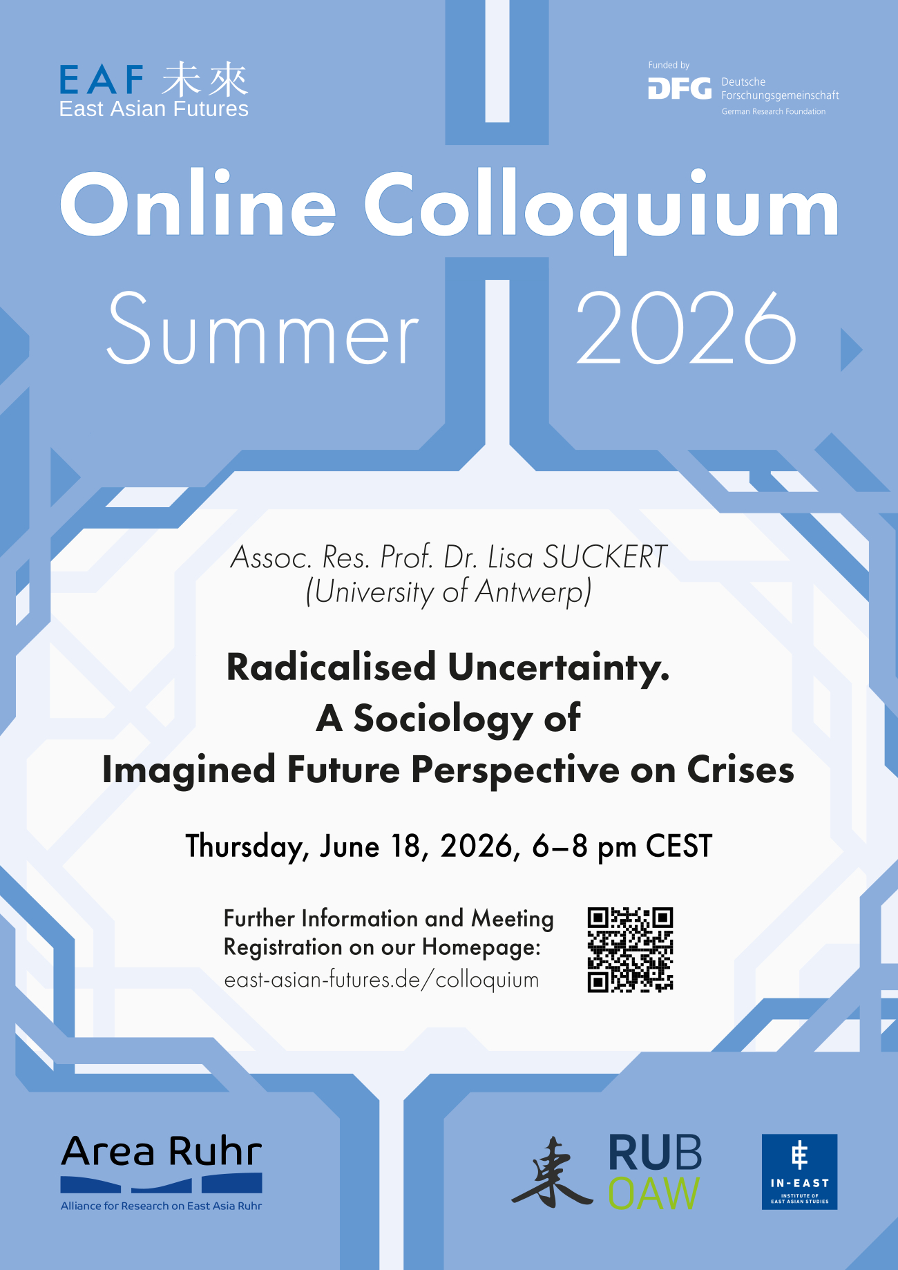 Each term, since its establishment, the Research Training Group GRK 2833 “East Asian Futures” has been hosting an open Online Colloquium in which external researchers from various scientific backgrounds are invited to present their research on conceptions and visions of the future in regards to East Asia.
